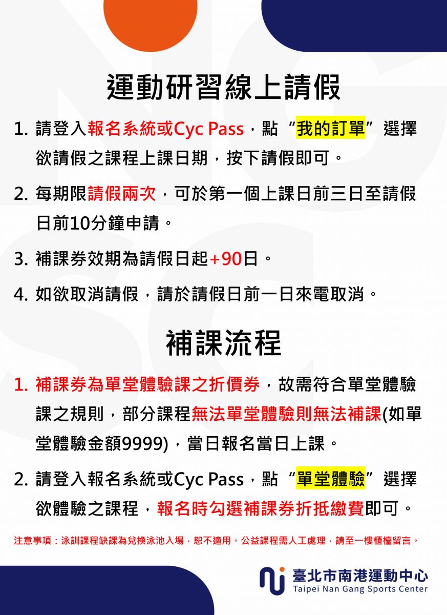 新一期請假系統將於12/26開啟,逐日開放週一至週日之課程請假,請登入報名系統或Cyc Pass,點"我的訂單",選擇欲請假之課程上課日期,按下請假即可。